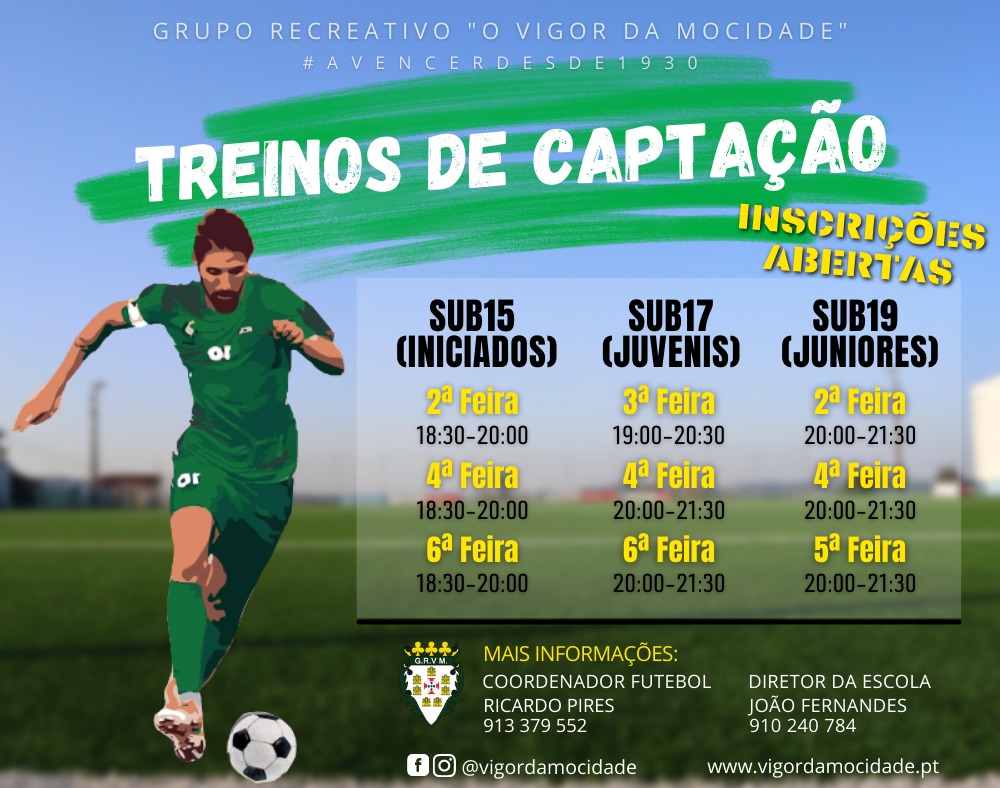 Se nasceste entre 2004 e 2009 contamos contigo nos treinos abertos no Vigor para os escalões de Sub15, Sub17 e Sub19 💚